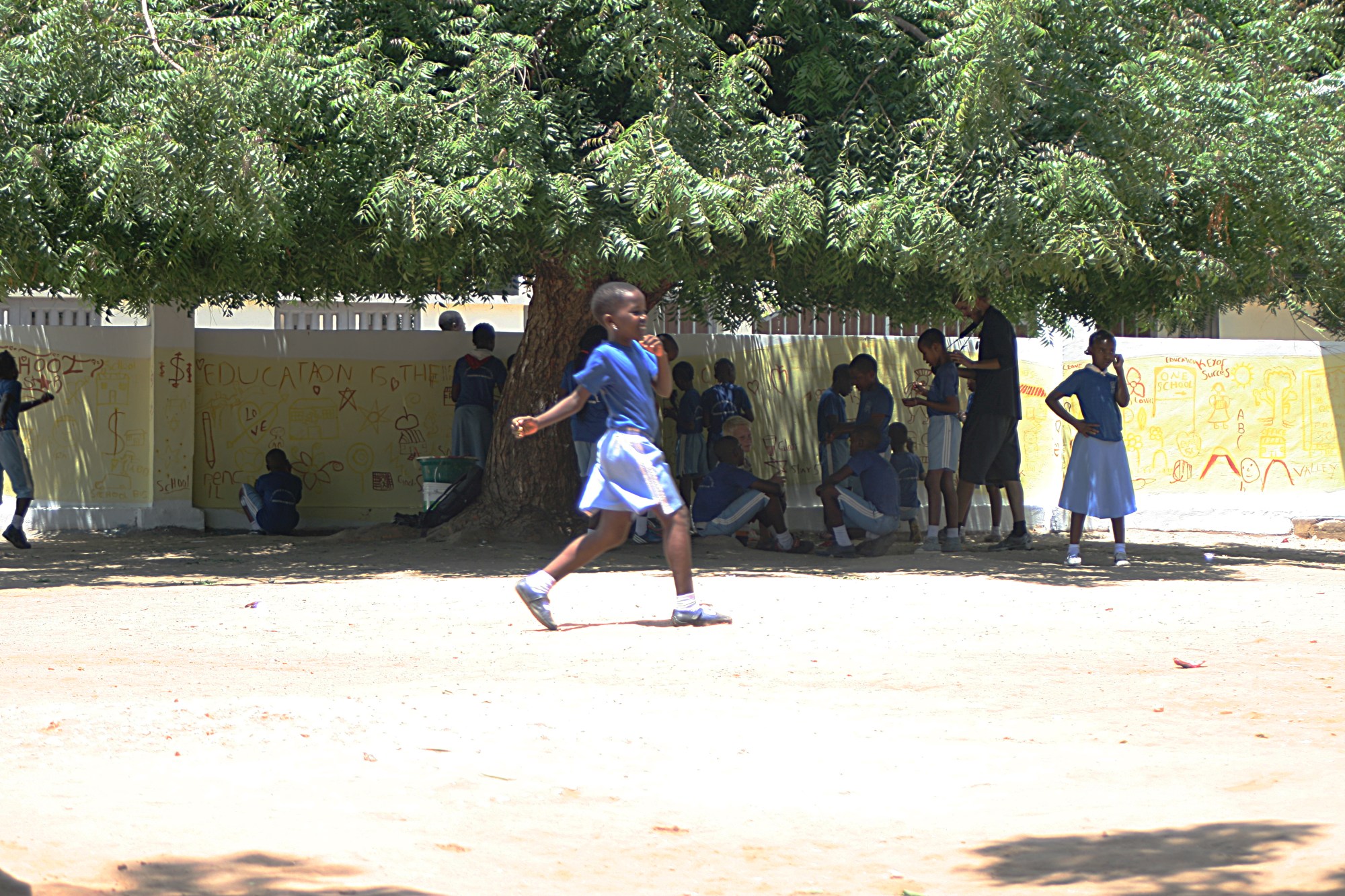 We were allocated a wall on the school grounds, luckily under neath a huge tree which saved us from melting in the heat of the day while working! The workshops we ran with the children were brilliant! The children took a lot of time in thinking what they wanted on their wall with messages of “Education Is Our Future” appearing several times.